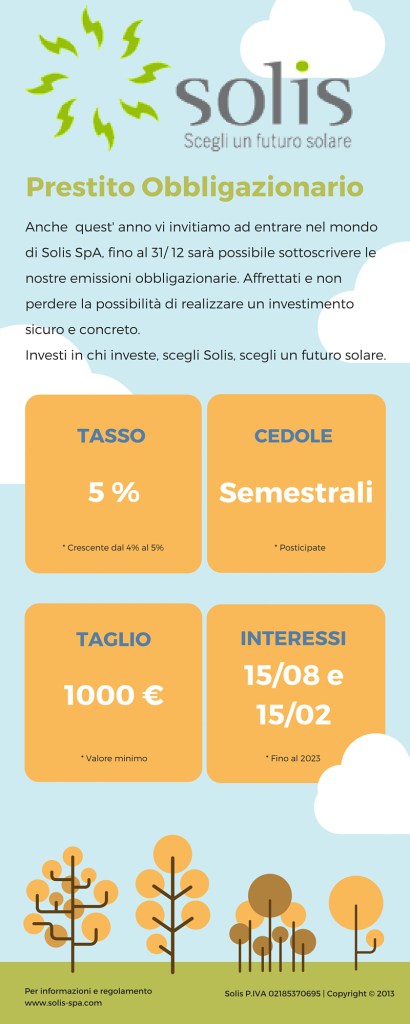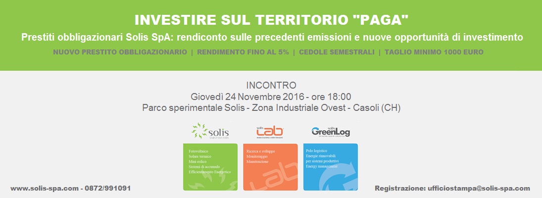 La SOLIS SPA organizza un evento dal titolo “Investire sul territorio paga” che si terrà presso il parco fotovoltaico sperimentale in Zona Industriale OVEST di CASOLI (CH) in data 24 novembre 2016 alle ore 18:00.